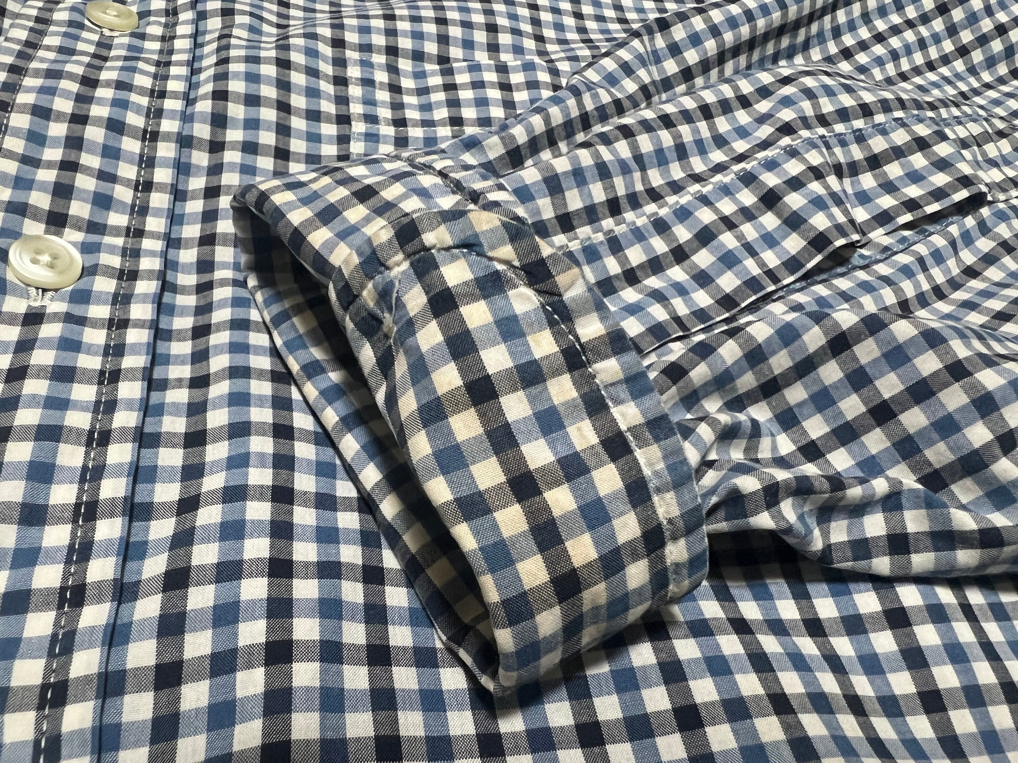 ブルーの細かいギンガムチェックで、どこか上品な印象のあるボタンダウンシャツです。